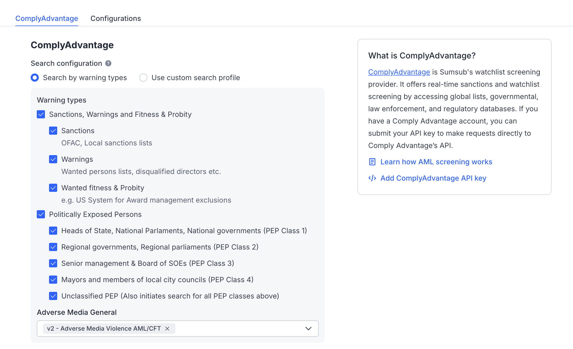 Sumsub uses AML data supplied by third-party providers. By default, your applicants will be screened by ComplyAdvantage, and then the matches will be processed using both ComplyAdvantage’s and Sumsub’s internal algorithms and techniques.