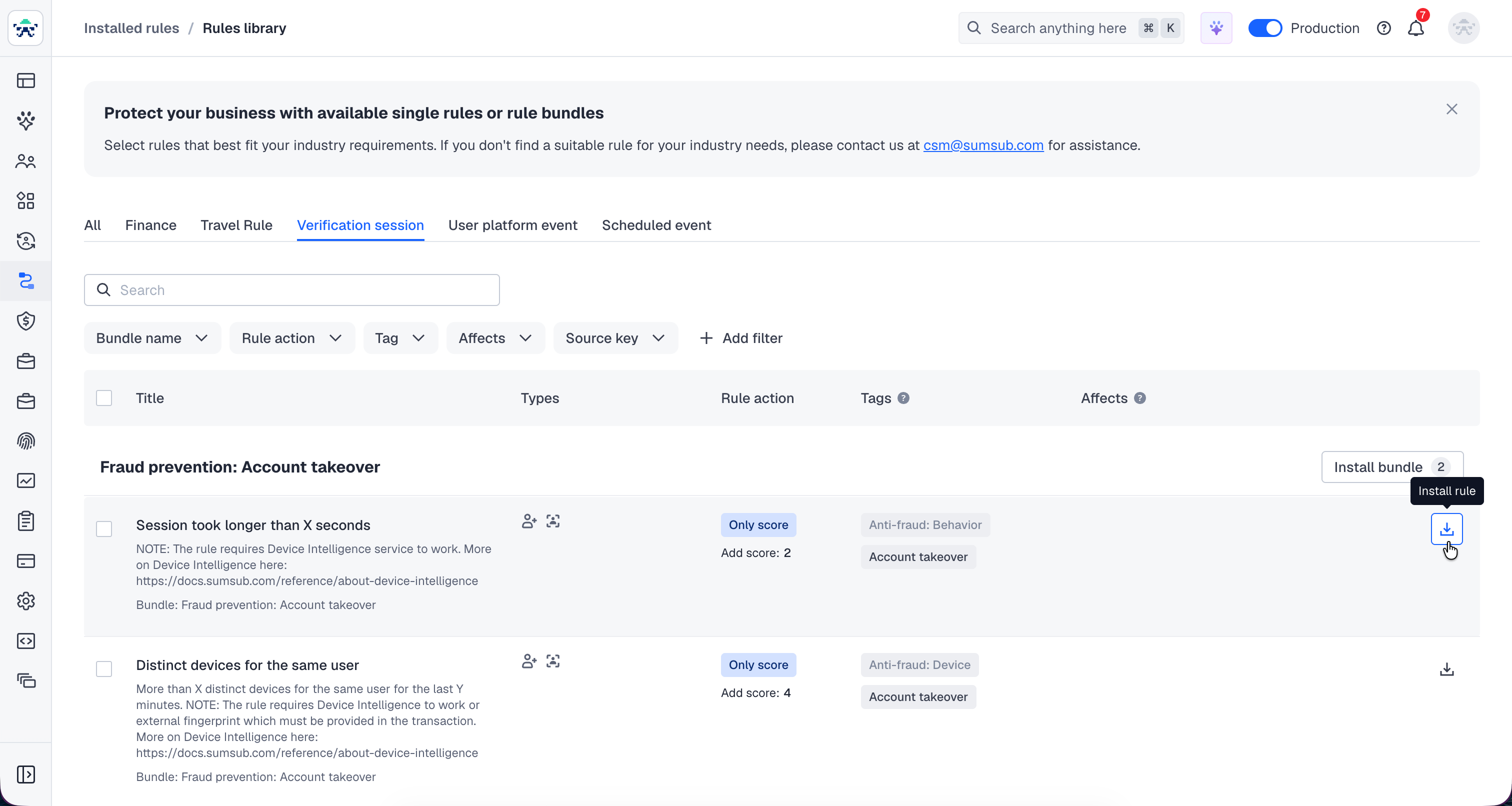 Alternatively, you can install all the rules available in the bundle by selecting Install bundle. Also, you can select the rules in the table, and at the bottom of the page, click Install selected rules.