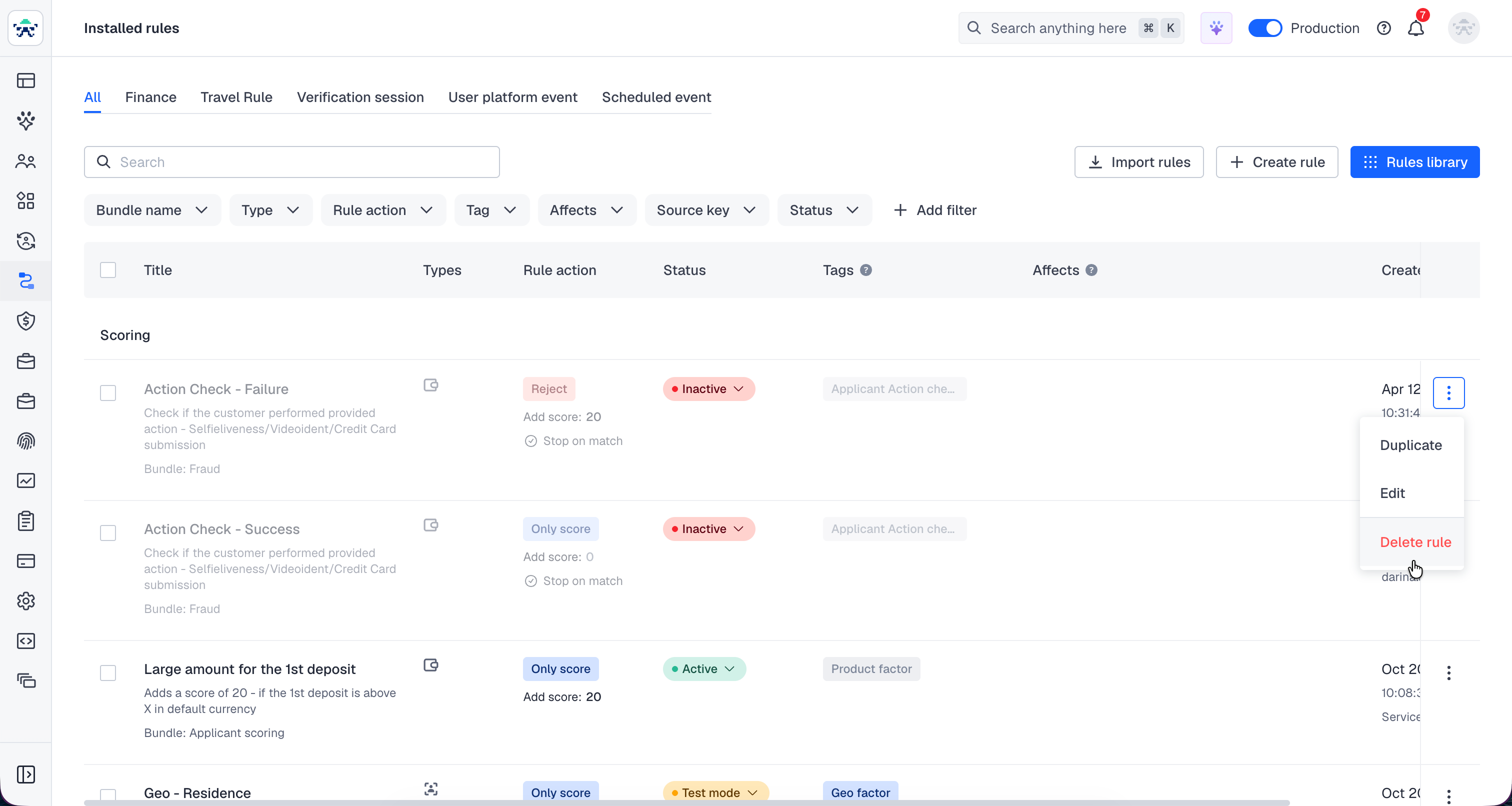 After deletion, a rule remains in the system as archived for 30 days. In case a rule was deleted occasionally, or you decide to continue using this rule, you can easily restore it within this period.