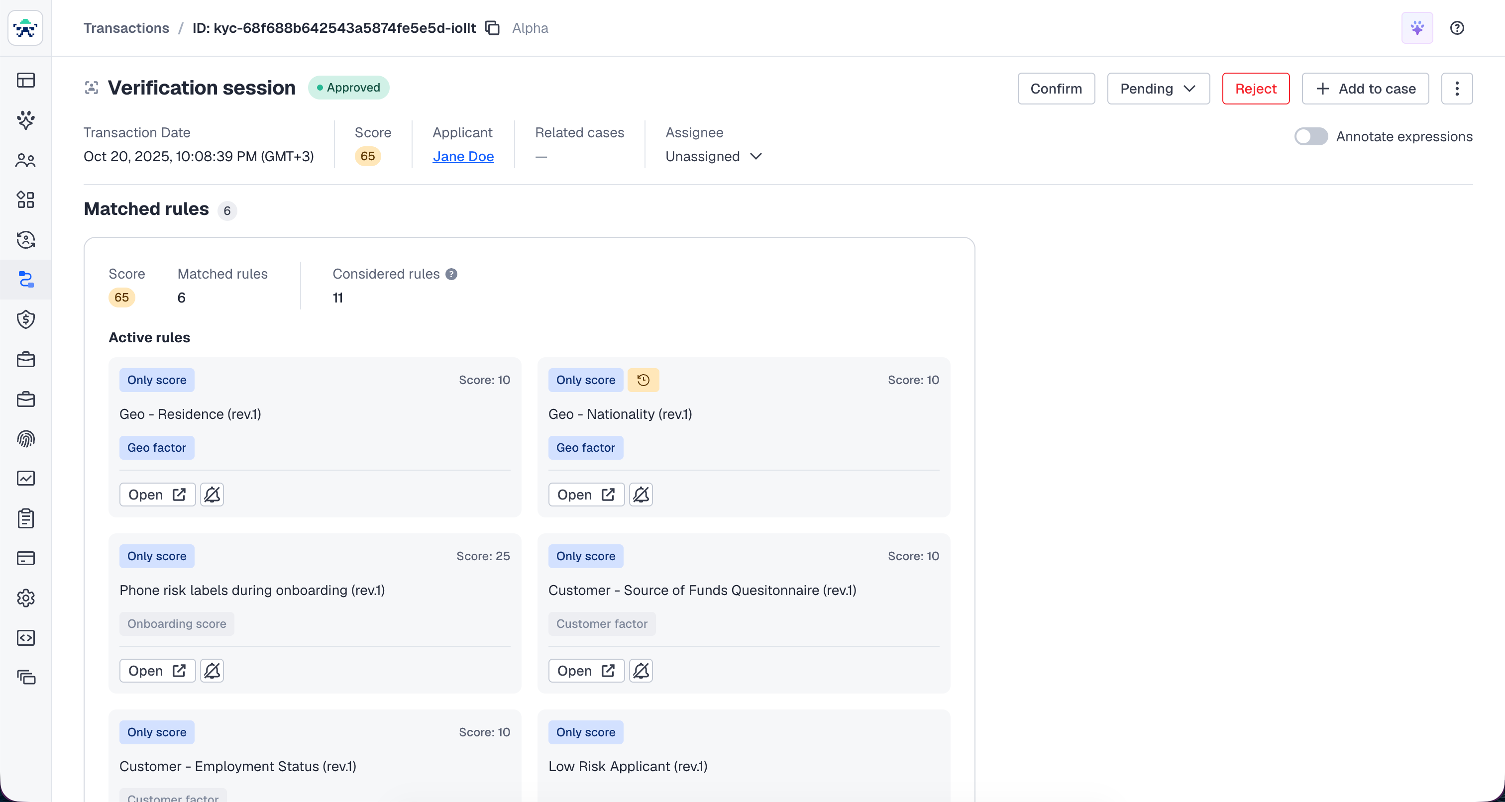 Test mode allows you to test the risk matrix or check how the newly created rule or condition would affect your transactions without impacting the transaction status or risk score. Test results are displayed in real time, allowing you to easily calibrate your risk policy or rules.
