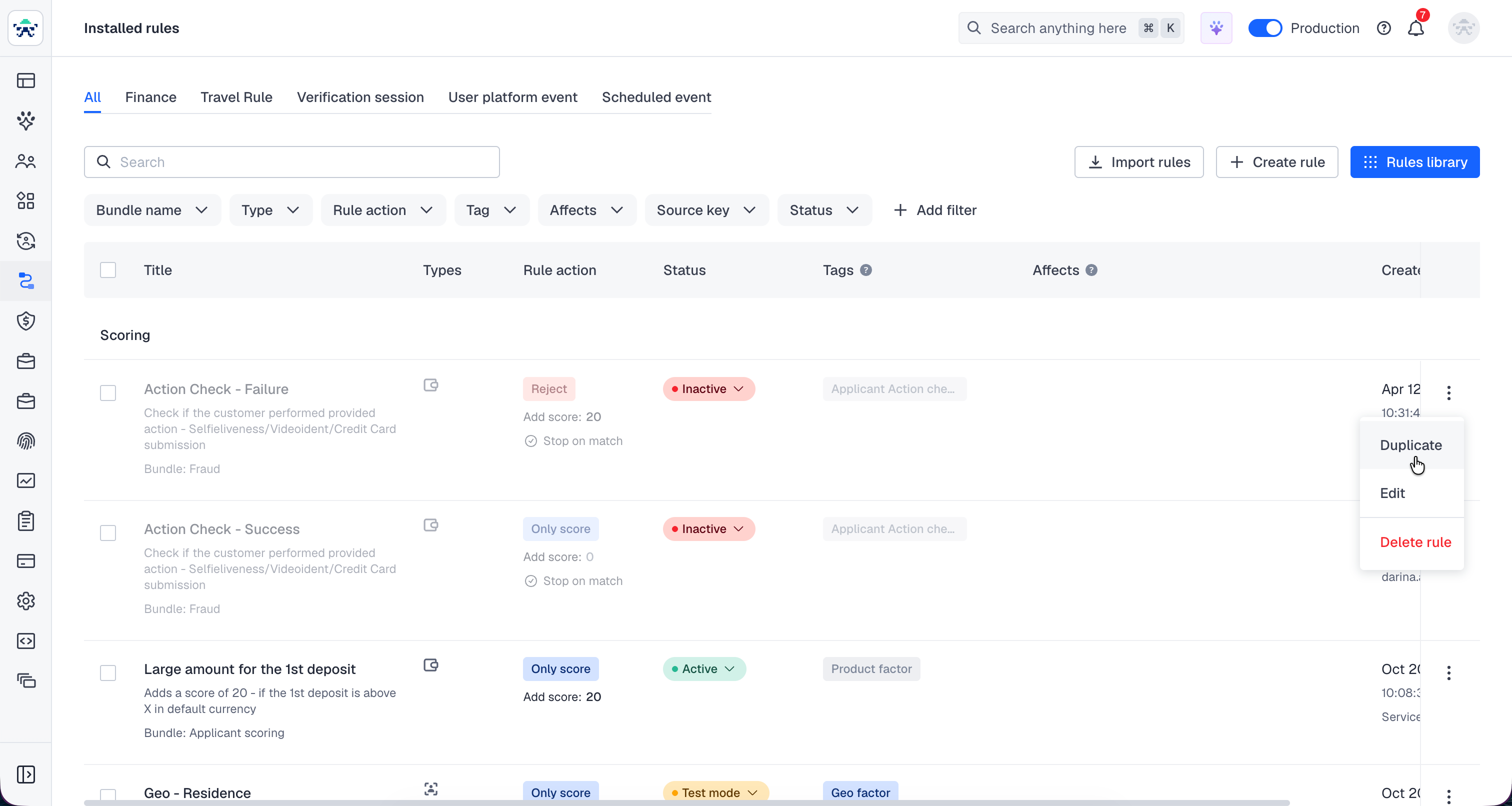 - Find the rules that you want to duplicate, and from the menu on the right, select Duplicate.
