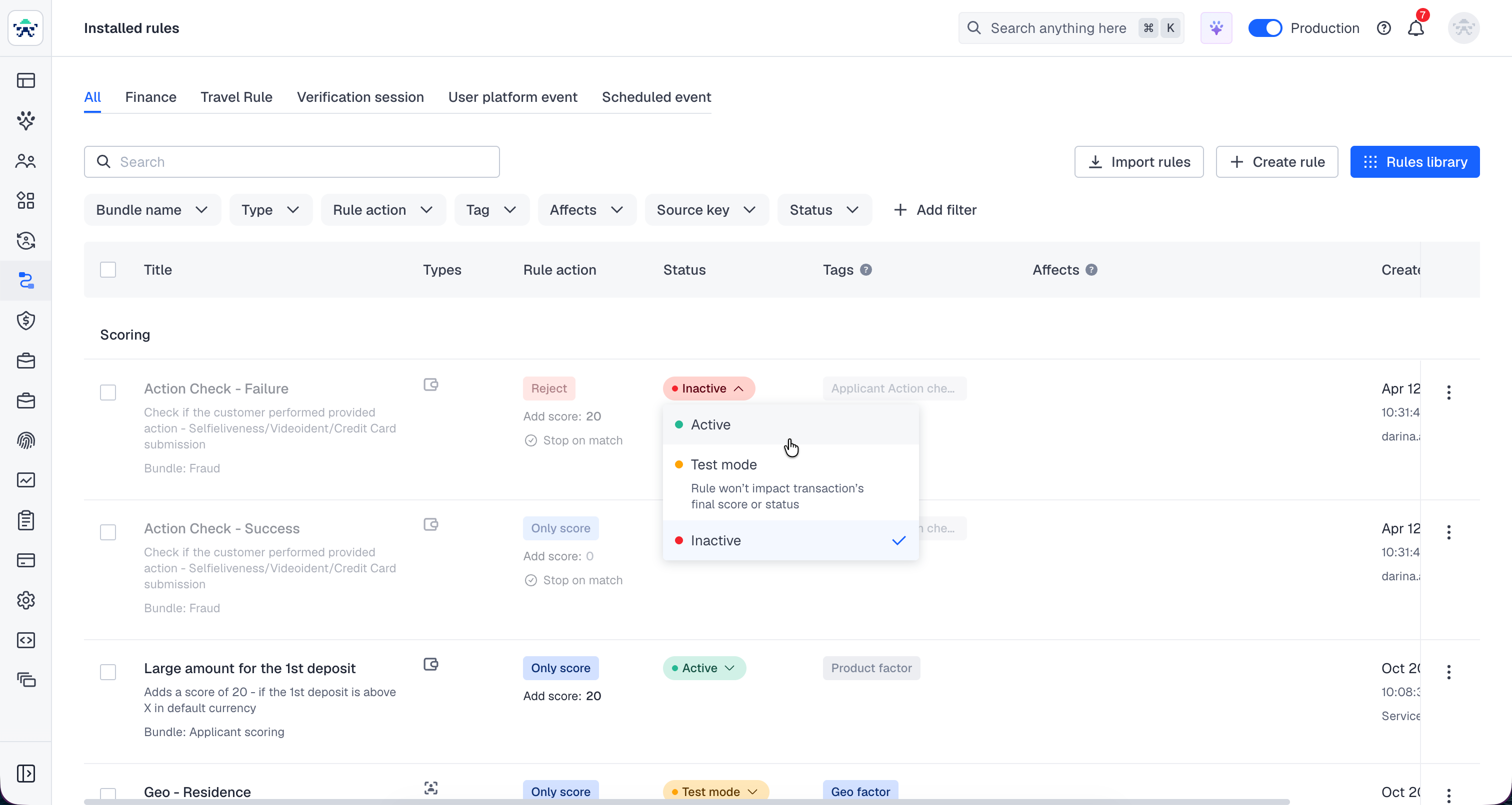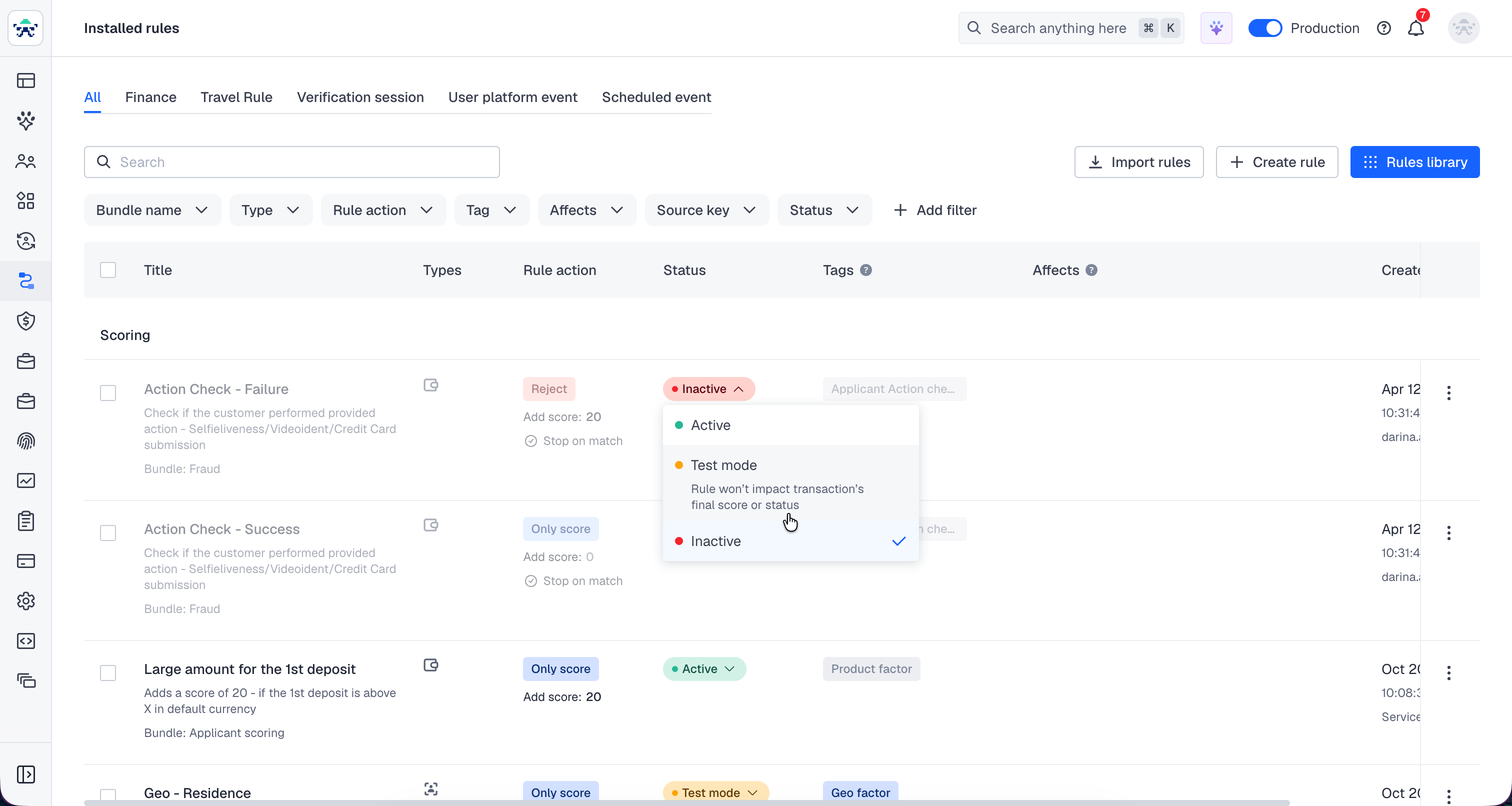 All rules that you install remain in Test mode until you activate them. Test mode allows rules to be tested without affecting the transaction final score or status.