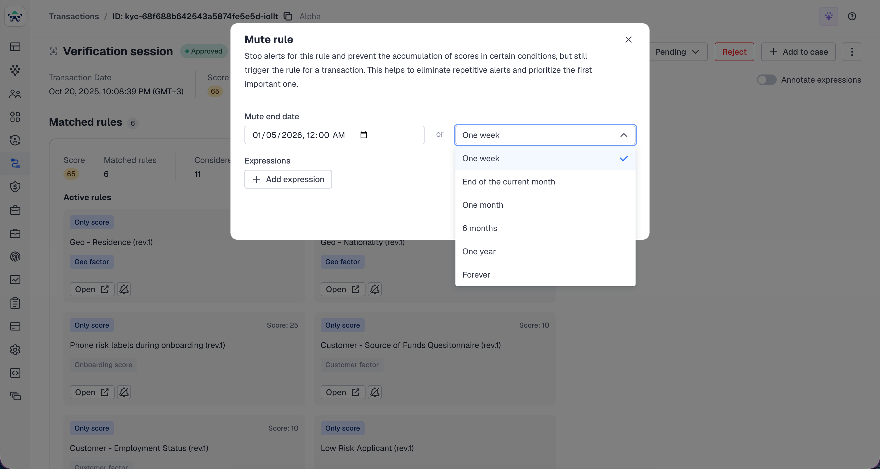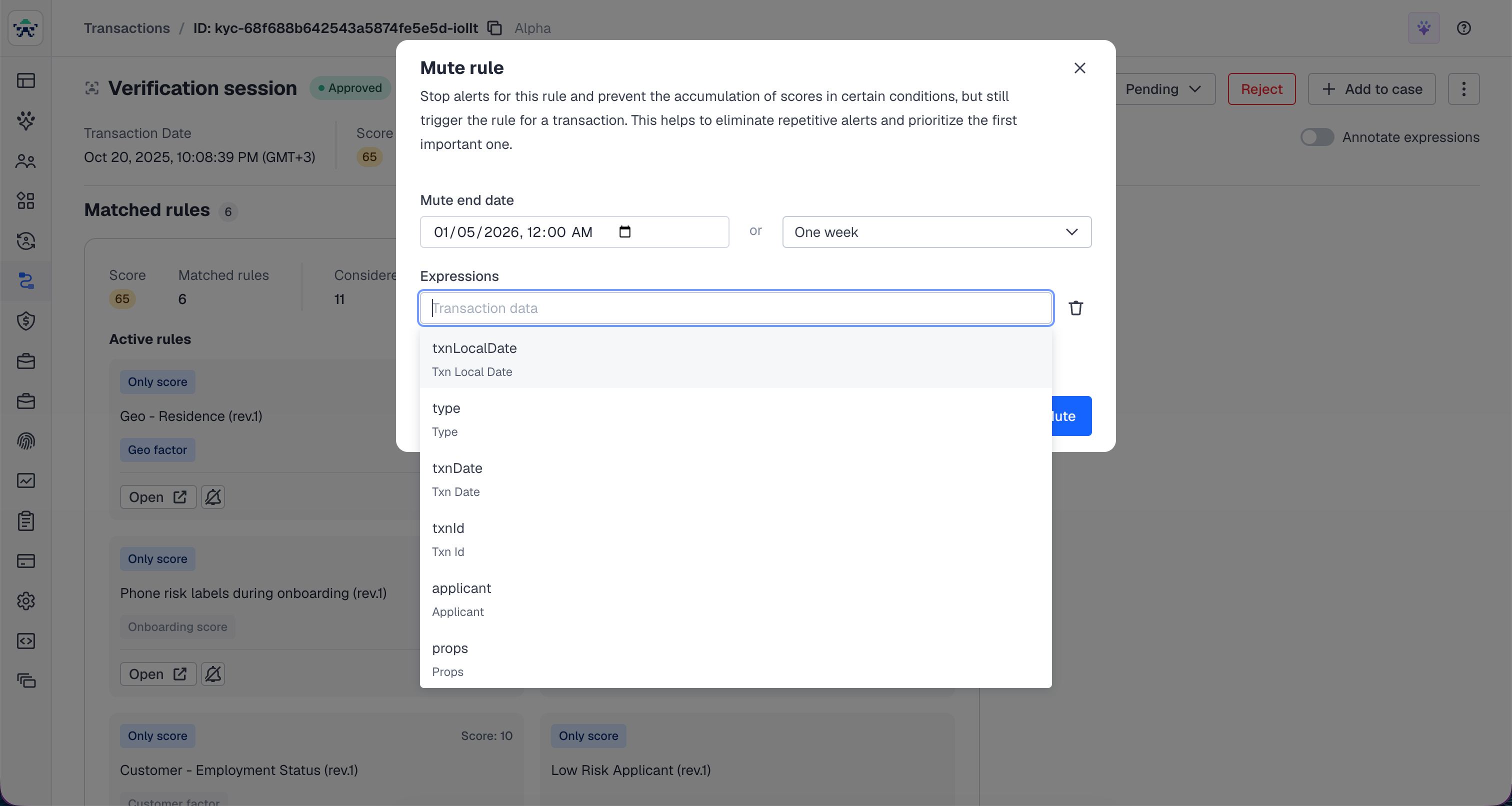 - If you want to limit the mute by counterparty, transaction creation date, or any other parameter, pick the needed expression from the Expressions drop-down list.