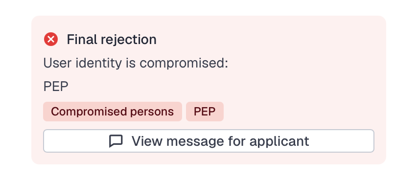 | Incomplete data | incompleteName | COMPROMISED_PERSONS | The name the applicant entered is incomplete, so the system could not match it against the watchlists properly. |