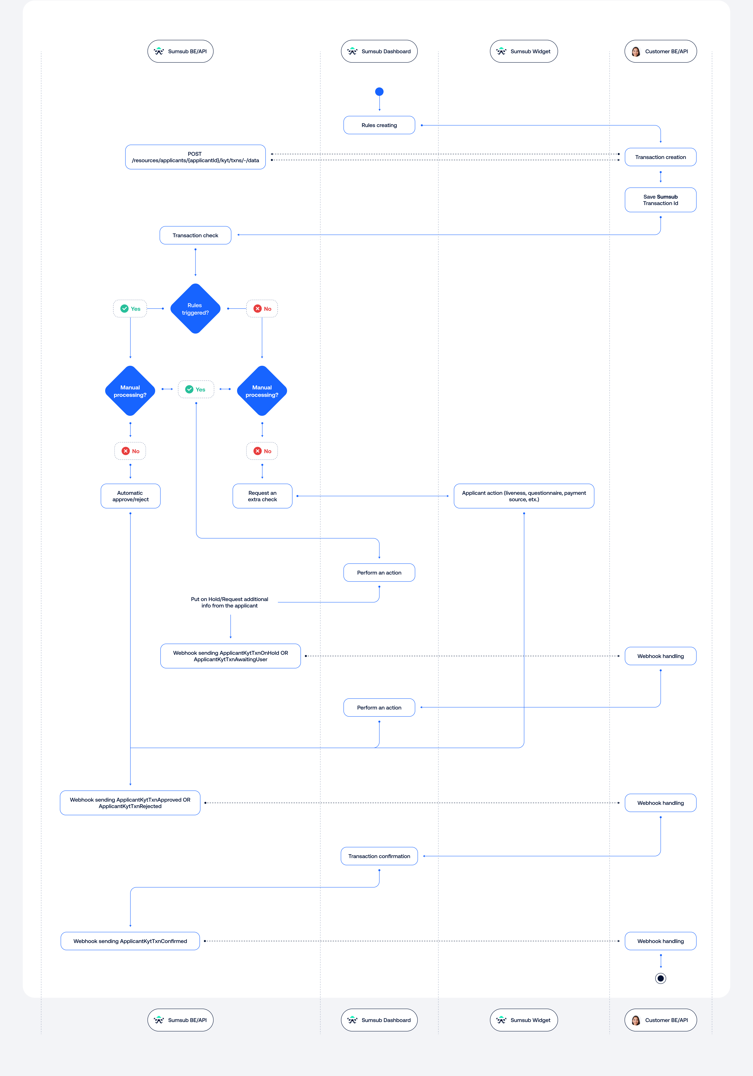 To start using the Sumsub Transaction Monitoring solution, you need to request access to Sandbox and/or Production via your account manager. After that, you must: