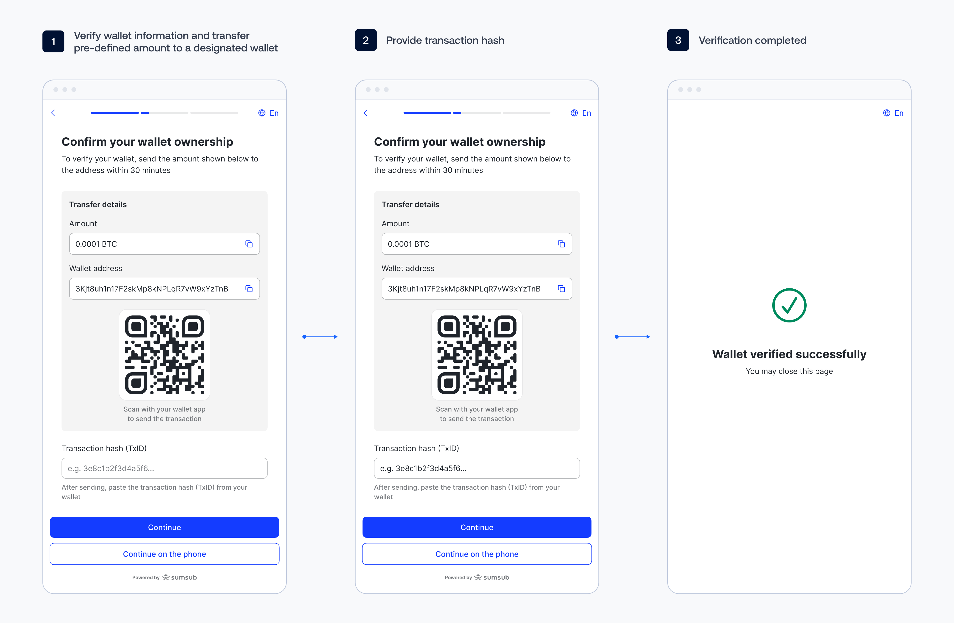 - Sumsub confirms that the correct pre-defined amount was sent to a designated wallet address.