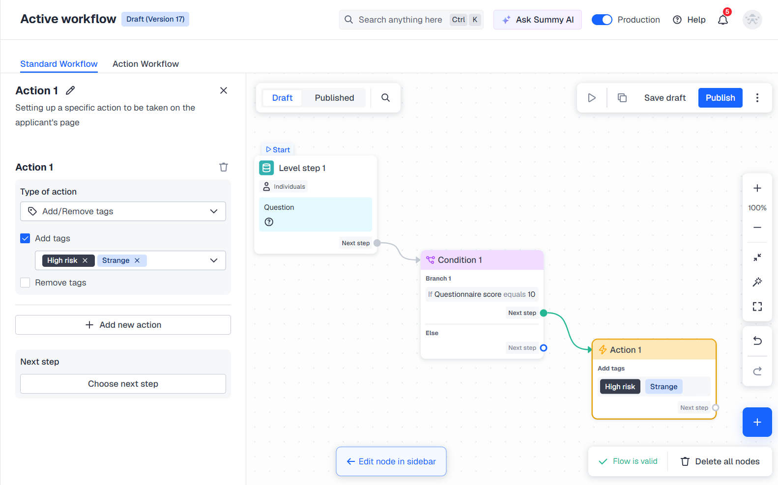 Once the flow is created and configured, you can save the draft, perform test verification, and publish the flow to run the checks: