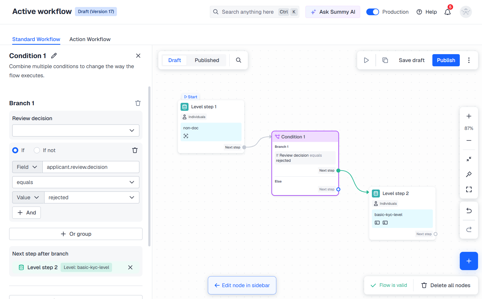 To provide the ability to proceed with standard verification, configure the Condition node and add one more verification level to the flow: