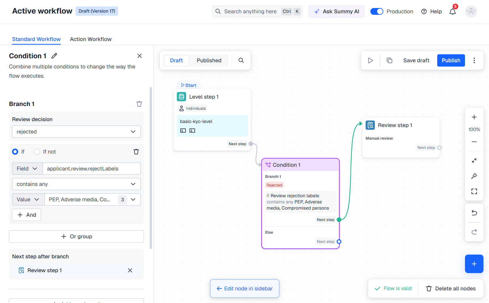 Once the flow is created and configured, you can save the draft, perform test verification, and publish the flow to run the checks: