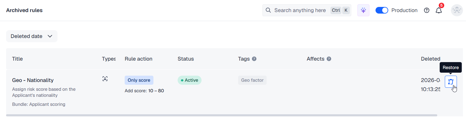 After deletion, a rule remains in the system as archived for 30 days. In case a rule was deleted occasionally, or you decide to continue using this rule, you can easily restore it within this period.