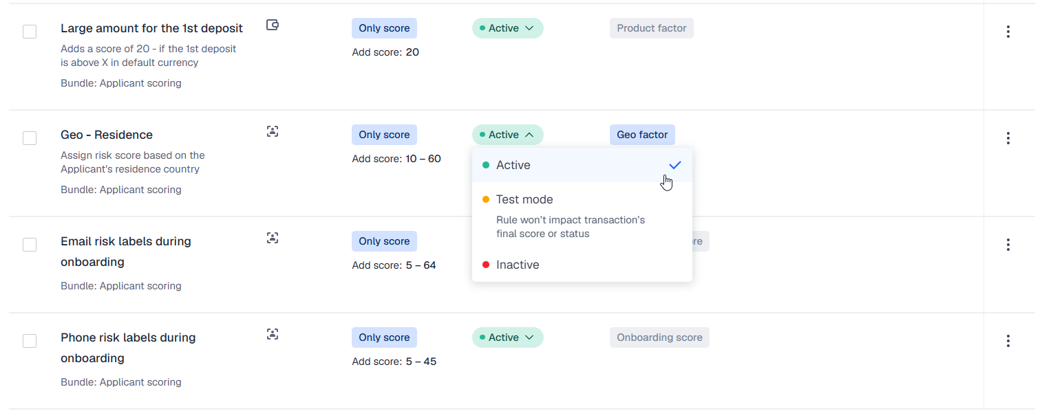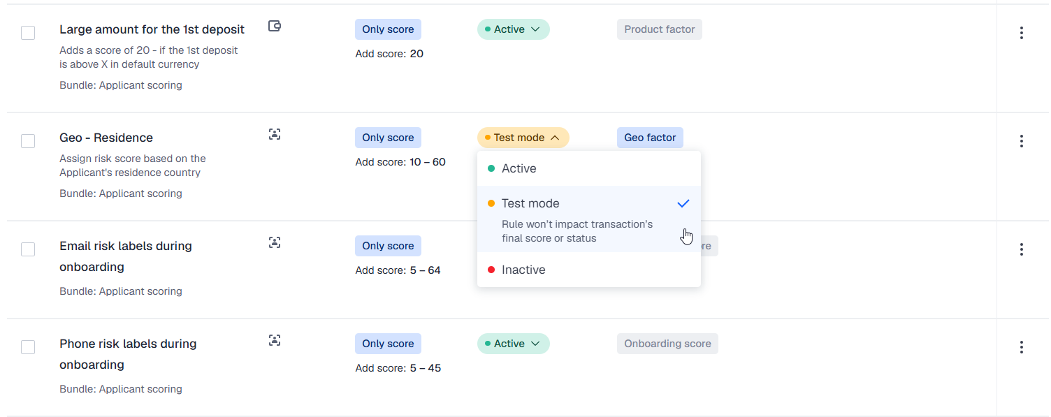 All rules that you install remain in Test mode until you activate them. Test mode allows rules to be tested without affecting the transaction final score or status.