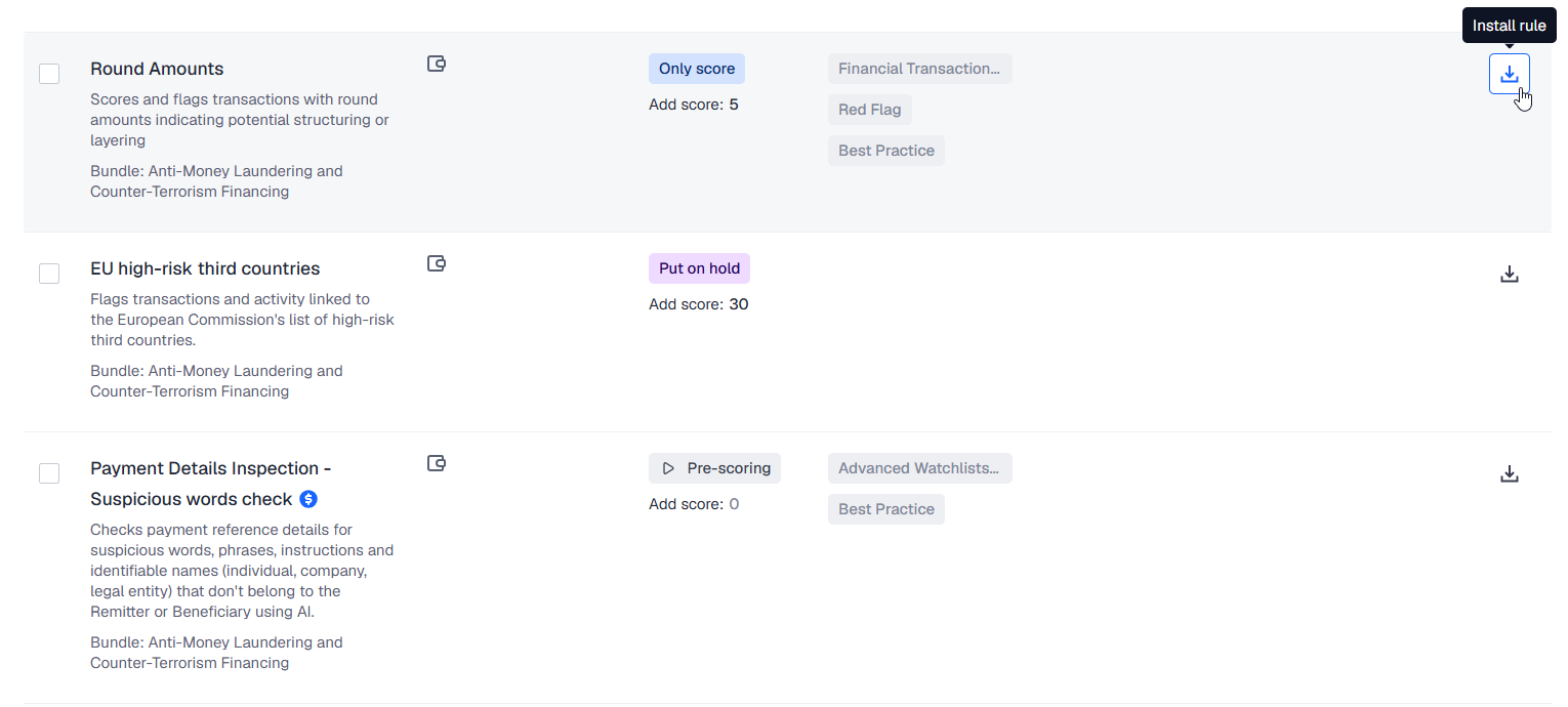 Alternatively, you can install all the rules available in the bundle by selecting Install bundle. Also, you can select the rules in the table, and at the bottom of the page, click Install selected rules.