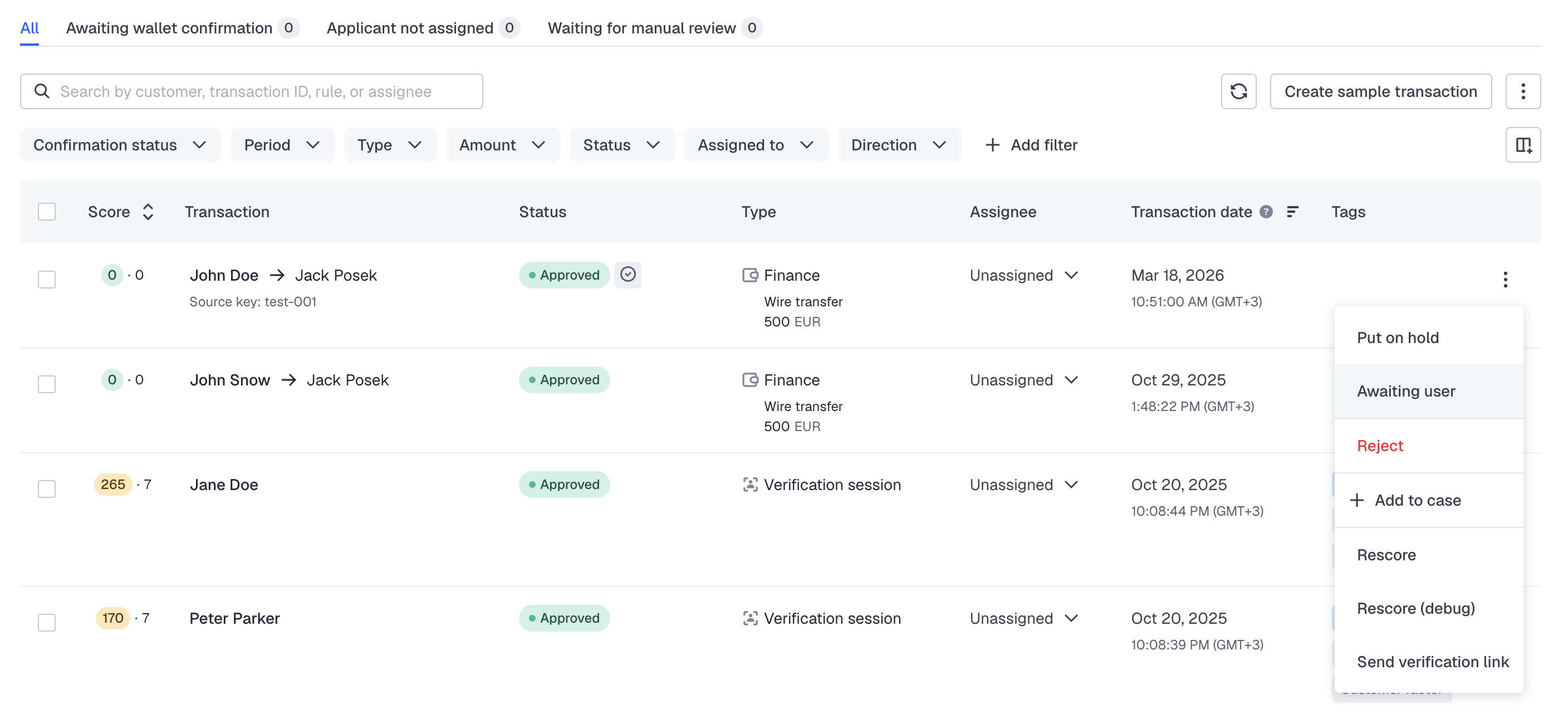 - Find transactions that you want to suspend and from the menu on the right, select Awaiting user.