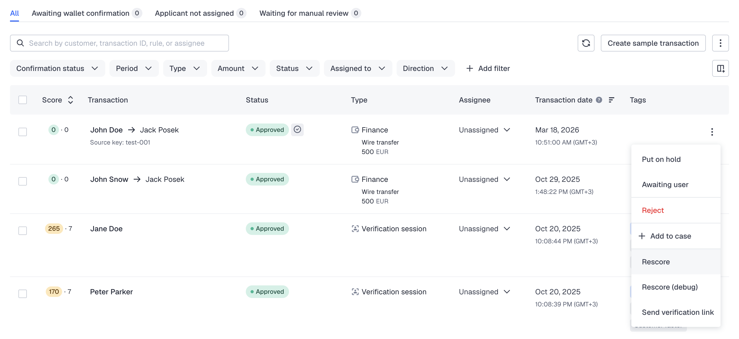 - Find transactions that you want to rescore and from the menu on the right, select Rescore.