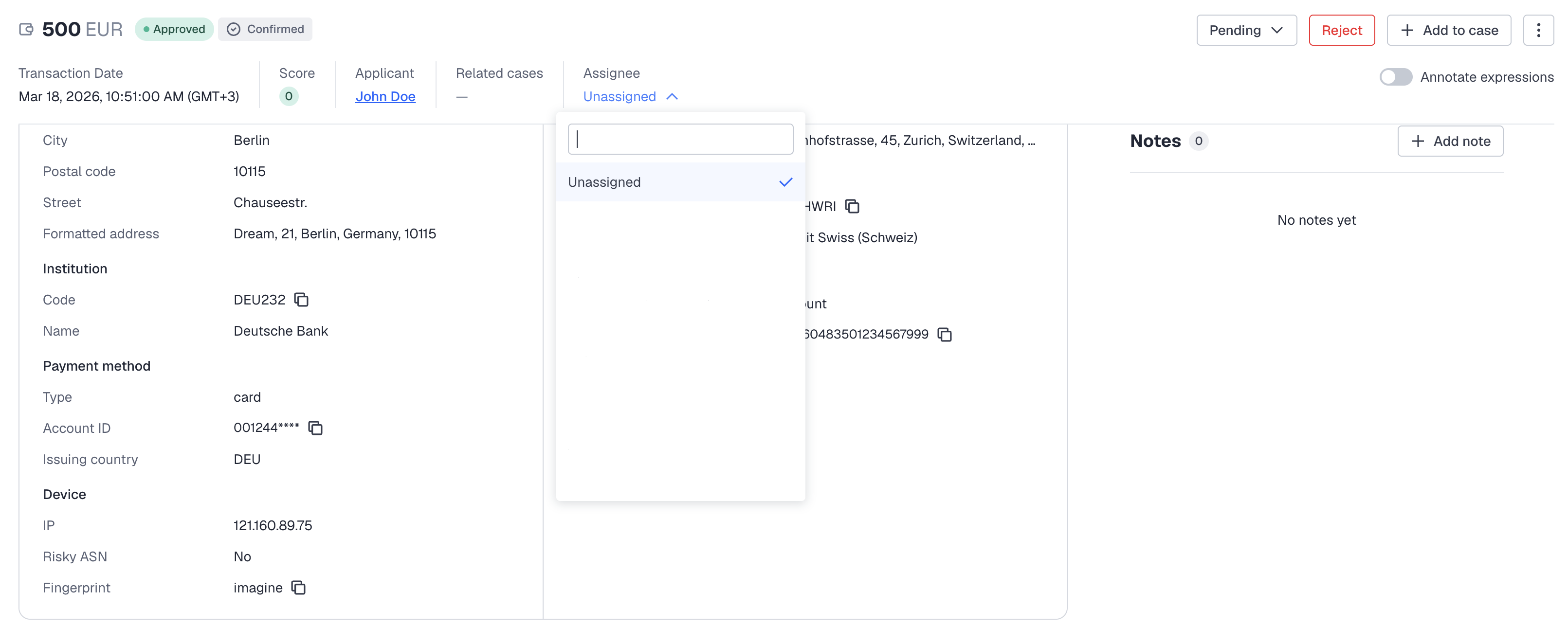 - Find transactions that you want to assign and select the assignee either from the Assignee drop-down list in the transaction table or directly in the transaction profile.