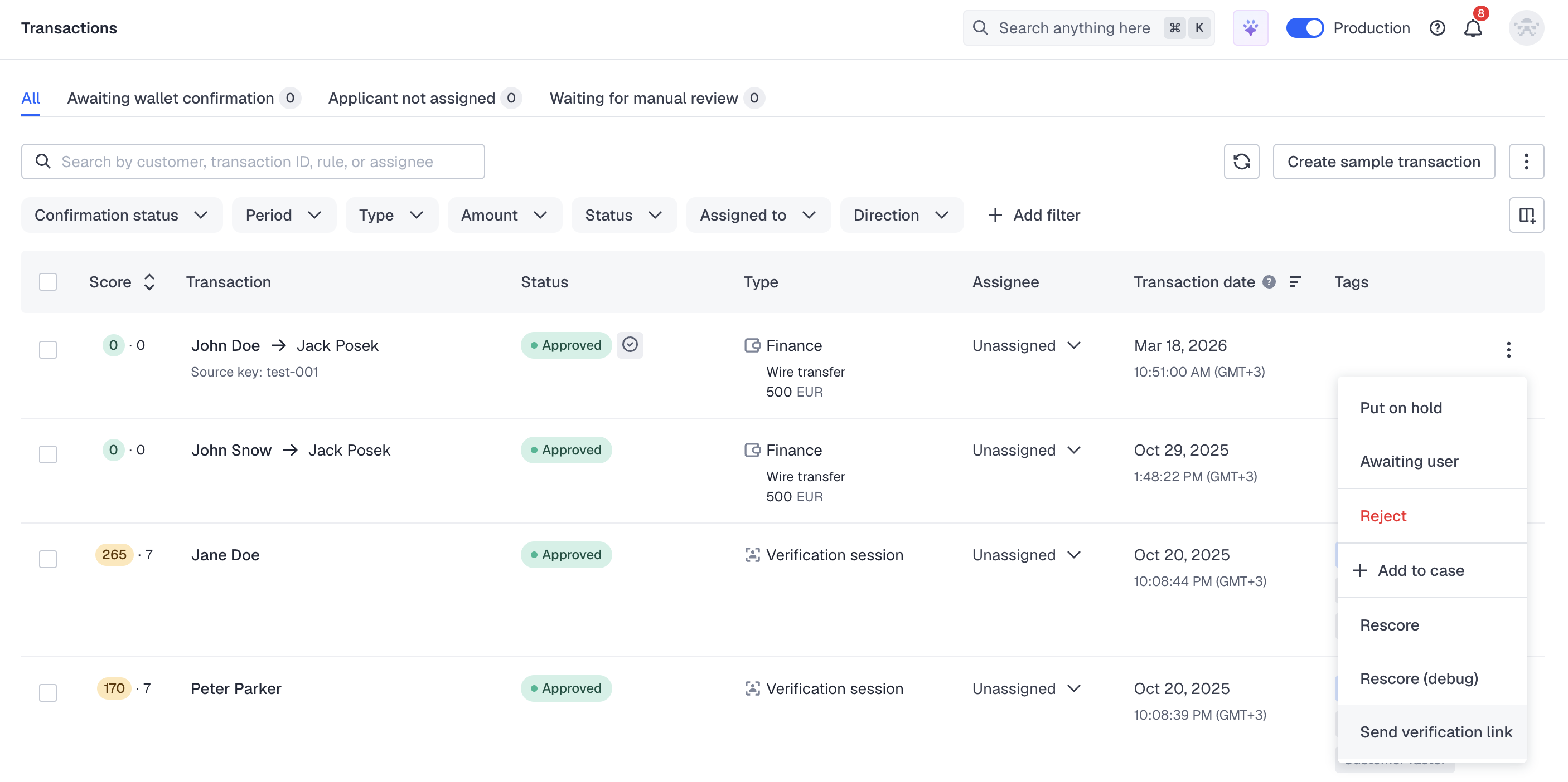 You can send verification links to the applicants who make transactions to request passing verification.
