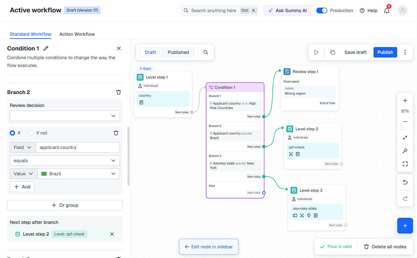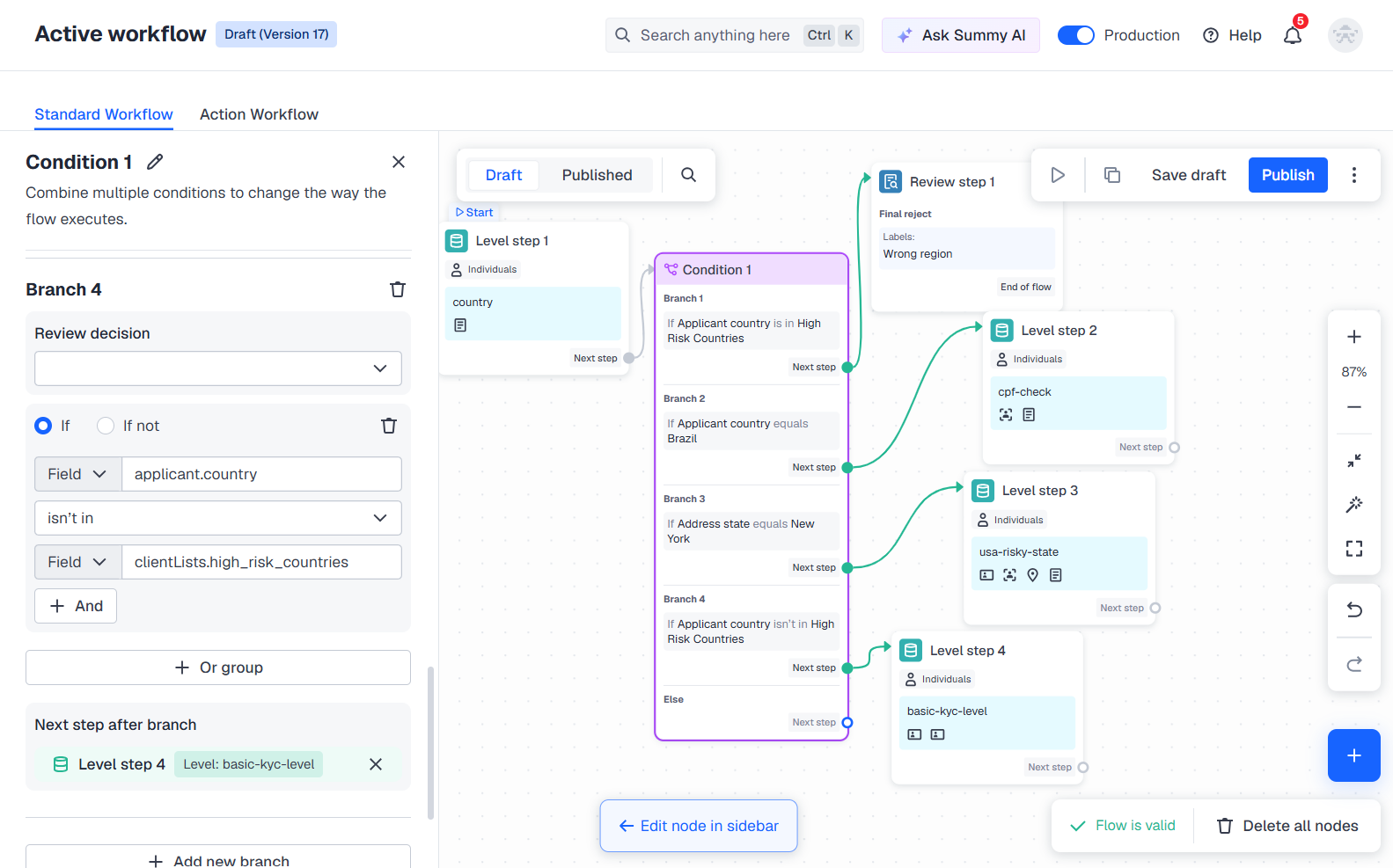 - Add the level step node as the next step after the brunch and select the verification level for the risky US states.