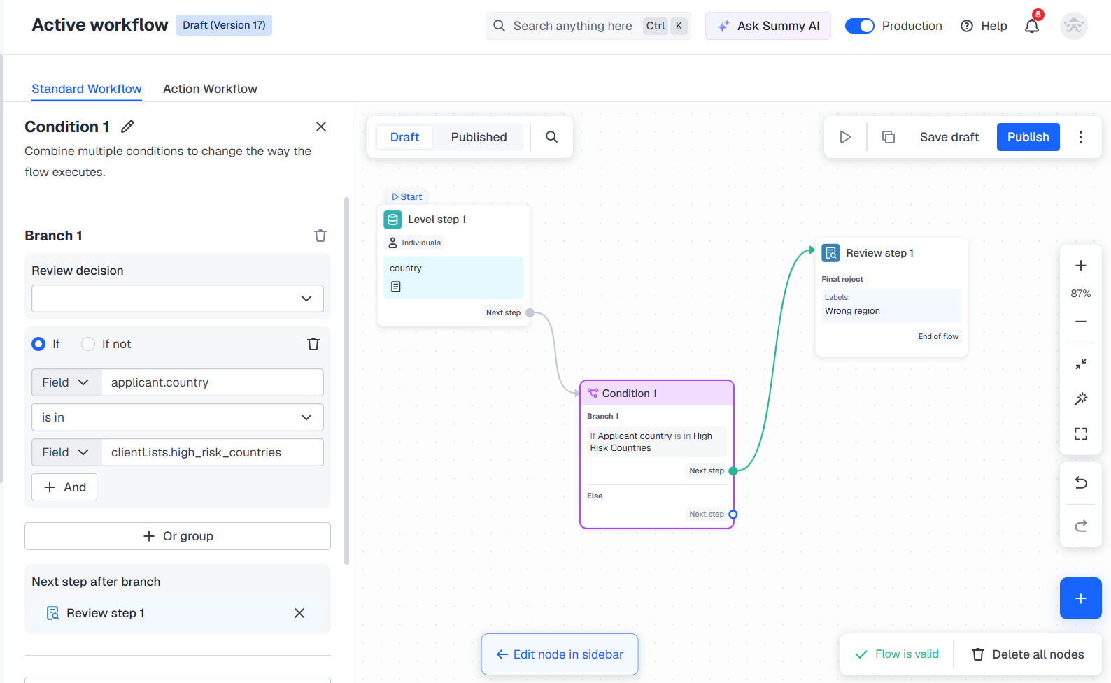 Once you get the picture of the verification process that you want to set up, you can add more nodes to your canvas and adjust them by the logic that is suitable for each case—request additional checks or reject applicants.